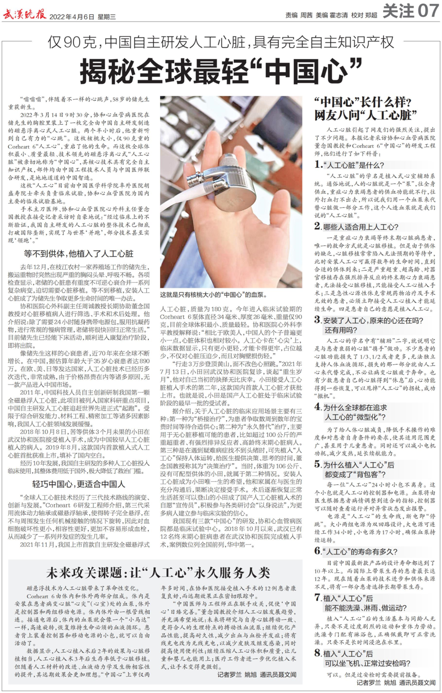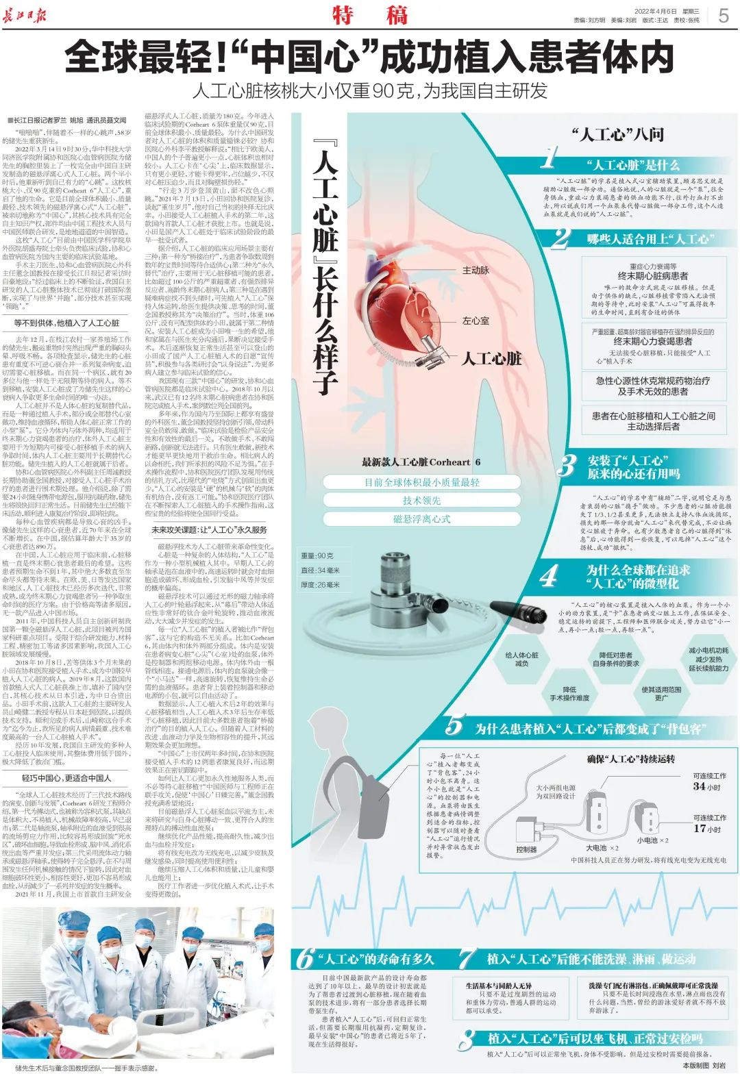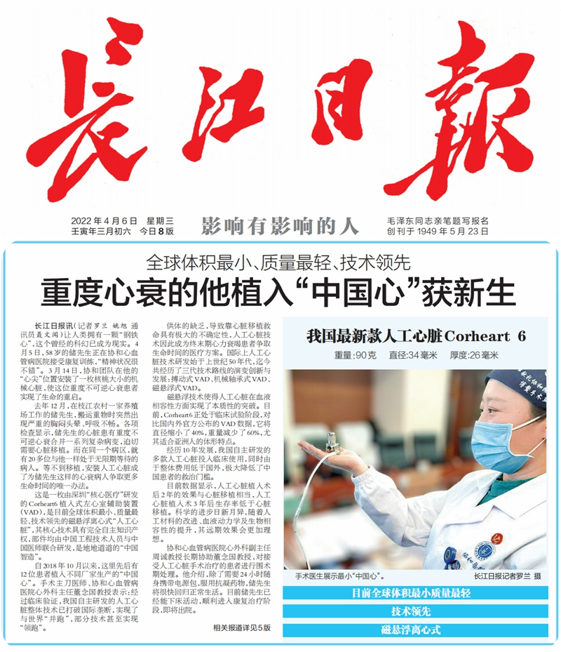 本次植入的超小型磁悬浮离心式人工心脏又叫CorHeart 6左心室辅助系统,属于第三代心室辅助装置,具有自主知识产权,是颗地道的“中国心”。泵体直径34毫米、厚度26毫米、重量90克,如一枚核桃大小,系目前全球尺寸最小、重量最轻的磁悬浮离心式人工心脏。目前由阜外医院胡盛寿院士牵头负责临床试验。