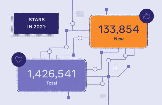 2021年,Github上Meta的项目数量累积了133854颗星,总共有1426541颗星。可以看出,Github社群对Meta的开源项目兴趣越来越大,也越来越乐意参与进来。