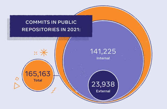 从项目参与的人数看,2021年有165163人已经加入了Meta的公共项目,比2020年增长20%。这些人里面有23838人不是Meta的员工,可见其影响力有多么的大。员工数量还维持在141225人。