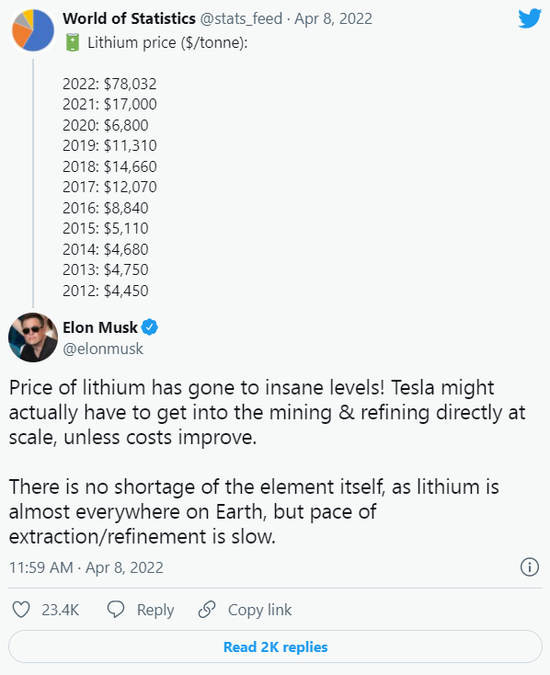 美东时间4月8日周五,特斯拉CEO马斯克推文称,由于价格上涨,特斯拉可能不得不参与锂矿开采领域(以降低成本价格)。根据Benchmark Mineral Intelligence的数据,锂的成本在过去一年中已经上涨了480%以上。