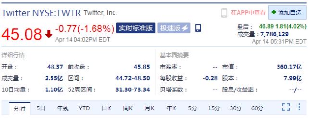 北京时间4月15日凌晨消息,美股周四,推特股价盘前一度涨超15%,随后股价震荡下行,截止收盘,推特收跌1.68%,报45.08美元。不过在盘后交易中推特股价再次涨超4%。