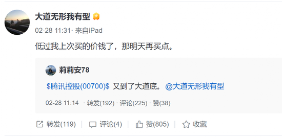 2月份,腾讯控股股价单月累计跌10.76%。今年2月底时他就已经发声,“腾讯低过我上次买的价钱了,那明天再买点。”