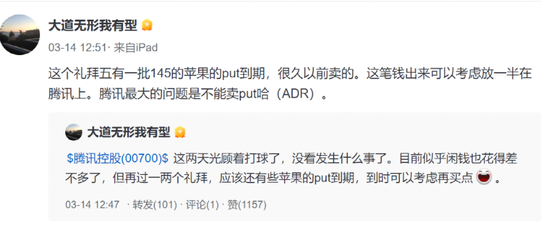 3月中旬,段永平又表示“这个礼拜五有一批145的苹果的put到期,很久以前卖的。这笔钱出来可以考虑放一半在腾讯上。” 整个3月份,腾讯控股股价单月累计跌11.16%。
