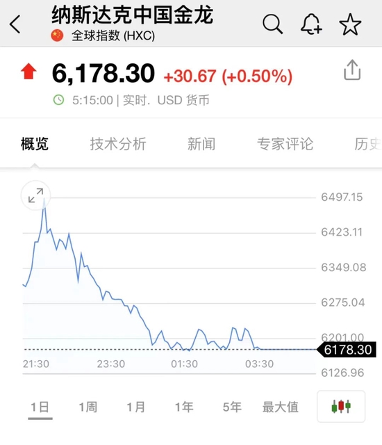 值得注意的是,当天中概股表现相对较为强势,纳斯达克中国金龙指数盘中涨幅一度扩大至5%,随后有所收窄,截至收盘涨0.5%。