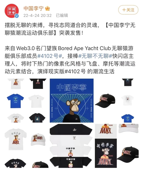 4月24日,中国李宁官方微博上一则“中国李宁无聊猿潮流运动俱乐部突袭发售”的消息,此次不仅将根据编号#4102号推出多款中国李宁无聊猿潮流运动俱乐部系列服装,编号#4102号还将成为无聊快闪店的主理人。