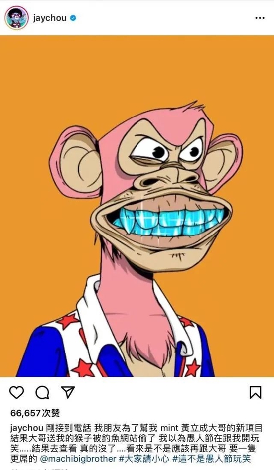 4月1日,周杰伦在社交平台表示,自己持有的无聊猿BAYC#3738NFT被盗。