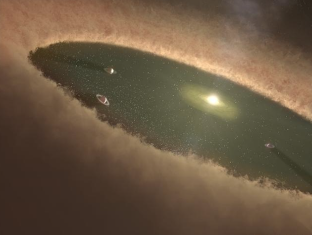 太阳系诞生之初,星际空间中的气体分子云坍缩,中心部分形成太阳,残余物质绕恒星旋转形成一个扁平的原行星盘。这个时期也被称为太阳系的气体盘时期,行星成长在行星盘内,与盘中气体相互作用,轨道逐渐圆化并向内迁移。