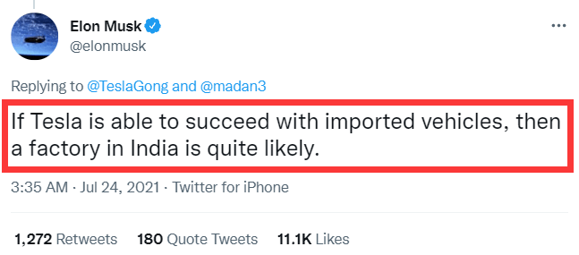 马斯克当时在推特上坦言,如果特斯拉能够在进口汽车上取得成功,那么在印度建厂的可能性很大。
