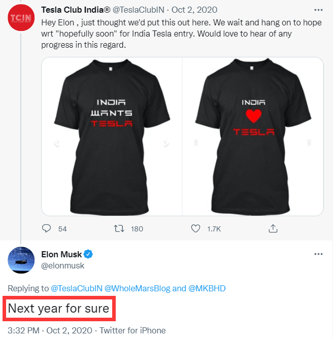 到了2020年,推特上又出现一篇建议特斯拉到印度投资的贴文,该贴文附有两件T恤衫图片,一件T恤上写着:“印度想要特斯拉”。马斯克当时回复道:“明年一定来”。