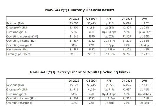 公司上调今年二季度和全年的业绩指引,并持续好于市场预期。预计二季度收入约为65亿美元(上下浮动2亿美元),同比增约69%,即保持高速增长态势,环比增约10%,预计主要由赛灵思和更高的服务器收入推动,二季度非GAAP毛利率约为54%。此前市场预计收入63.8亿美元。