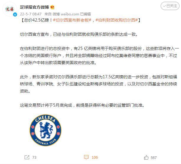 此外,新东家承诺对切尔西俱乐部进行总额为17.5亿英镑的进一步投资,包括对斯坦福桥球场、青训学院、女子队伍建设和金斯梅多球场的投资,以及对切尔西基金会的持续资助。