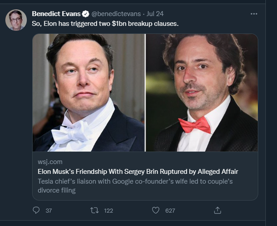 马斯克以最令人意想不到的方式,再次登上了娱乐新闻头条。《华尔街日报》发布重磅报道,称有知情人士揭露马斯克和谷歌联合创始人谢尔盖·布林之间长达20年的友谊突然破裂,原因居然是他跟布林的妻子有外遇。