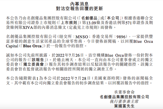 名创优品今日晚间公布了针对Blue Orca沽空报告的初步调查结果。在公告中,名创优品称,该报告中关于本公司特许经营业务模式的指控毫无依据;该报告指控公司创始人兼首席执行官叶国富通过一系列房地产交易挪用首次公开发售所得款项亦毫无依据;该报告关于本公司业务前景的描述毫无依据。