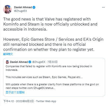 但Epic/Origin平台目前仍然在封禁状态,官方也没确认是否会将在印尼进行注册。