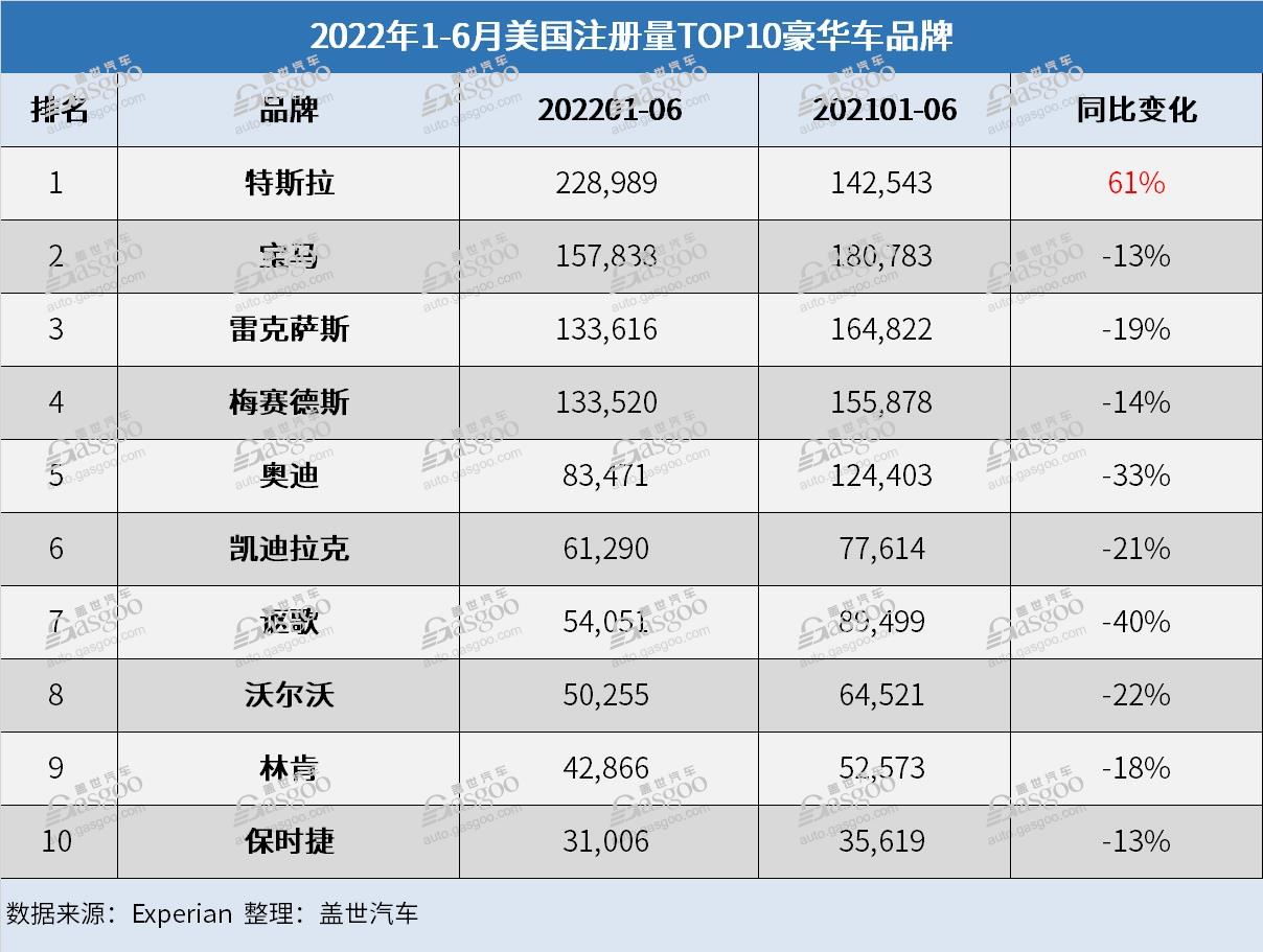 毫无意外,特斯拉上半年仍旧是美国注册量最高的豪华车品牌以及电动汽车注册量最高的汽车品牌。根据益博睿(Experian)的最新注册量数据,今年1-6月份,特斯拉在美国本土的新车注册量同比上涨61%,轻松超过宝马、雷克萨斯和奔驰等竞争对手。在今年上半年美国注册量TOP10的豪华品牌中,特斯拉是唯一实现注册量同比上涨的品牌,而其它品牌的跌幅均在10%以上。除了特斯拉之外,捷尼赛思是另外一个上半年美国注册量实现上涨的豪华车品牌。