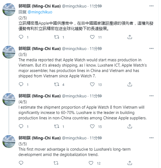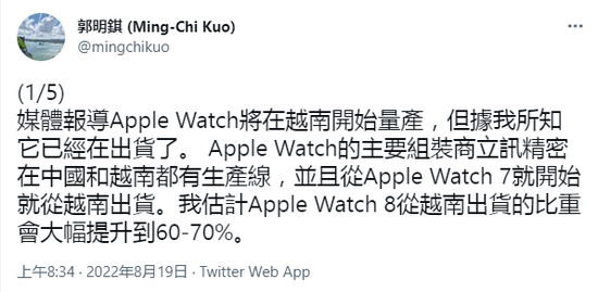 北京时间8月19日早间消息,郭明錤在Twitter上表示,媒体报道Apple Watch将在越南开始量产,但据我所知它已经在出货了。Apple Watch的主要组装商立讯精密在中国和越南都有生产线,并且从Apple Watch 7就开始就从越南出货。我估计Apple Watch 8从越南出货的比重会大幅提升到60-70%。