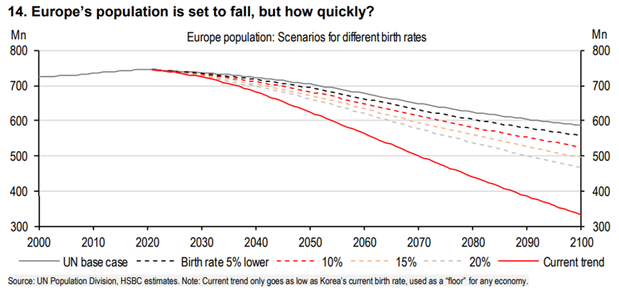 欧洲同样在人口减少的路上越走越远。欧洲目前的生育率约为1.5,近年来一直在低位徘徊。据汇丰计算,在最糟糕的情况下,即将韩国生育率作为“地板”生育率,欧洲人口到本世纪末将比当前水平减少4亿;即使按照联合国假设的生育率(乐观预测),到2050年,欧洲人口仍将减少5000万以上。