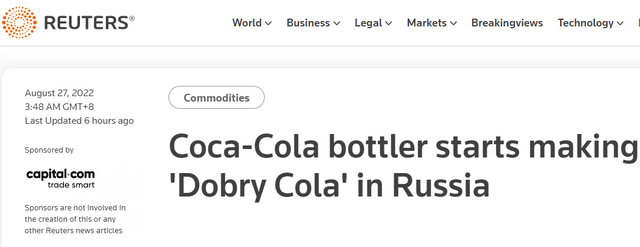 据报道,可口可乐HBC公司在一份声明中表示,“Dobry Cola”与可口可乐公司没有任何关系。路透社称,可口可乐公司拥有可口可乐HBC公司23%的股份。