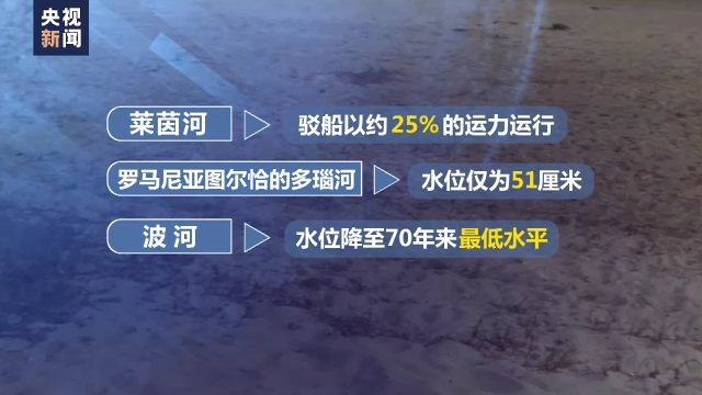 高温干旱给欧洲多条河流水位造成前所未有的压力,影响内河航运。莱茵河上驳船只能以约25%的运力运行。罗马尼亚图尔恰的多瑙河水位仅为51厘米,而安全航行的最低标准为57厘米。意大利最长河流波河水位近期降至70年来最低水平。