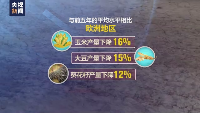 农业受到的冲击最为直接。欧洲地区今年玉米产量将比前五年的平均水平下降16%,大豆和葵花籽的产量将分别减少15%和12%。