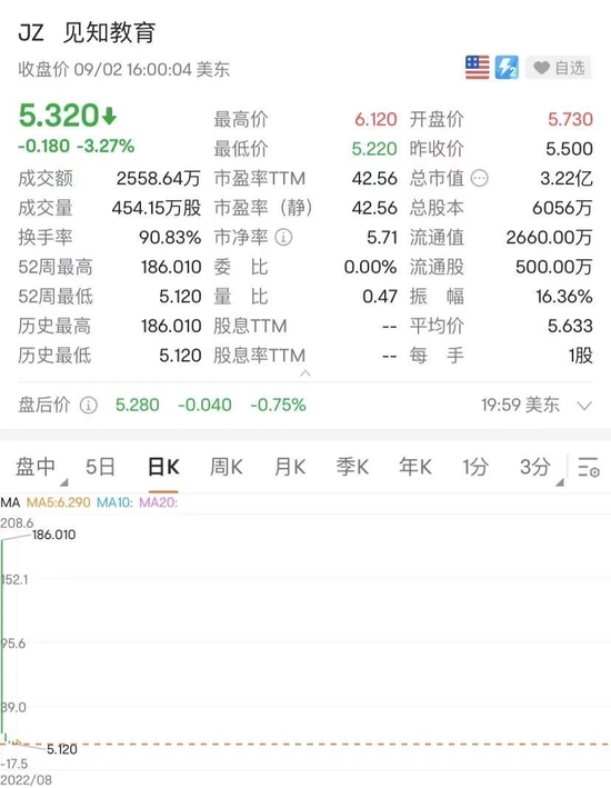 8月26日,见知教育赴纳斯达克上市,开盘后股价一飞冲天,盘中一度暴涨超36倍,当天收涨275%。不过,随后股价连续三天大跌,截至9月2日收盘,该股股价已跌至5.32美元/股。