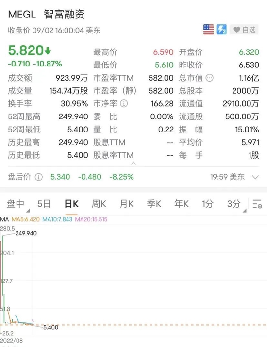 8月5日在纳斯达克上市的智富融资,上市首日股价一度摸高至235.95美元/股,暴涨超52倍,盘中多次触发熔断,截至当日收盘,报收97美元/股,上涨2325%。然而仅仅3个交易日,智富融资大跌89.47%,换手率攀升至57.36%。截至9月2日收盘,该股股价已跌至5.82美元/股。