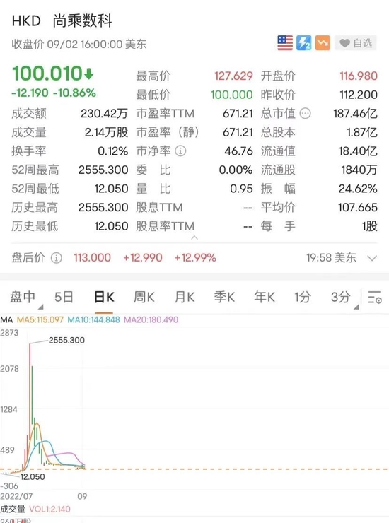 今年7月15日登陆纽交所的尚乘数科,仅13个交易日股价最高触及2555.3美元/股,涨幅超300倍,总市值一度飙至3100亿美元,超越阿里巴巴、京东、拼多多等一众龙头中概股。此后尚乘数科一路下行,截至9月2日收盘,尚乘数科报收100.01美元/股,市值跌至187.46亿美元。