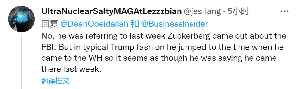 但也有人认为,这是典型的“特朗普风格”:“不,他指的是上周扎克伯格公开谈论FBI 的事儿。只是以典型的特朗普风格说了出来,他(的思维)跳到了他入主白宫的时间,所以看起来他好像在说他(扎克伯格)上周才来白宫。”↓