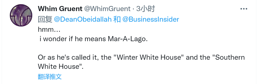 “唔……我想知道他的意思是不是想说海湖庄园。或者用他的话说,应该是‘冬季白宫’,‘南方白宫’”。据媒体此前报道,特朗普当选总统后,海湖庄园曾因“冬季白宫”的称号而吸引了广泛的关注。