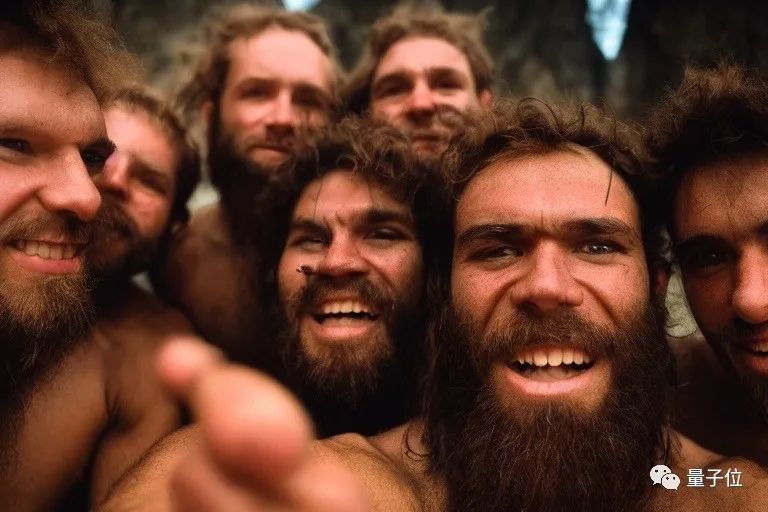 还有脑洞大开的沙雕网友,用Midjourney生成了一张山顶洞人的集体自拍……