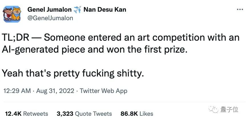 AI生成的画作,已经能在艺术比赛拿大奖了?没错,这是真事。一位小哥用AI绘画工具Midjourney生成的作品,在美国科罗拉多州博览会的艺术比赛中获得了第一名。结果一宣布,人类画家们就炸了锅。一名艺术家在Twitter上的“犀利”吐槽已经获得了8万+点赞,1万+转发。