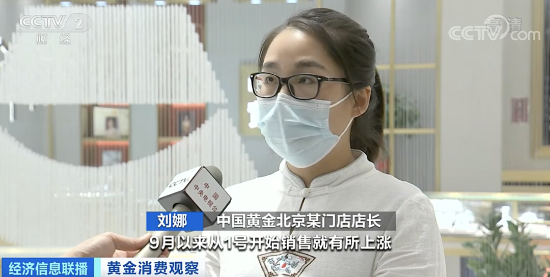 中国黄金北京某门店店长 刘娜:9月以来从1日开始销售就有所上涨,比平时增加10%左右,最近一周,销量增加20%左右。