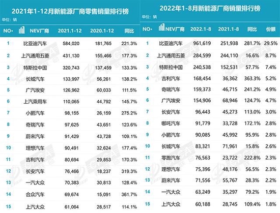 与此同时,合资车企的加入将进一步加剧新能源汽车领域的竞争。起亚营销本部本部长权一权在接受中新财经专访时就表示,“未来将加快新能源转型速度,5年内将在华投产6款纯电动车型。”而一汽-大众和上汽大众,仅凭数款新能源车型,就在2021年全年和2022年1-8月双双进入了新能源厂商零售销量排行榜前15名。