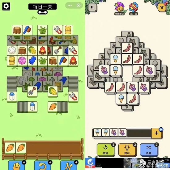 而不同于传统消消乐,《羊了个羊》将需要三消的卡牌依某种规则堆叠在一起,玩家需要由上至下的顺序把卡牌一一摆放至下方区域;当三种同样图案的卡牌排在一起时即完成消除。
