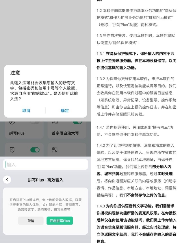 在首次开启微信键盘时,屏幕上会出现“此输入法可能会收集您输入的所有文字,包括密码和信用卡号等个人数据”的提醒。