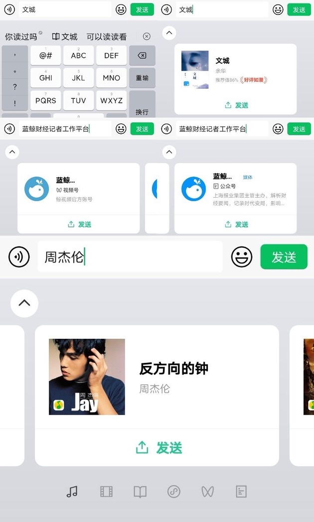 以“文城”为例,记者输入“文城”后,输入法自动会识别到相关书籍的推荐按钮,点击后便可出现微信读书端“文城”的相关链接;以“周杰伦”为例,记者输入“周杰伦”后,点击智能推荐按钮,键盘则自动出现周杰伦的多首QQ音乐作品链接;以“蓝鲸财经记者工作平台”为例,记者输入该关键词后,则出现相关视频号和公众号的名片链接。