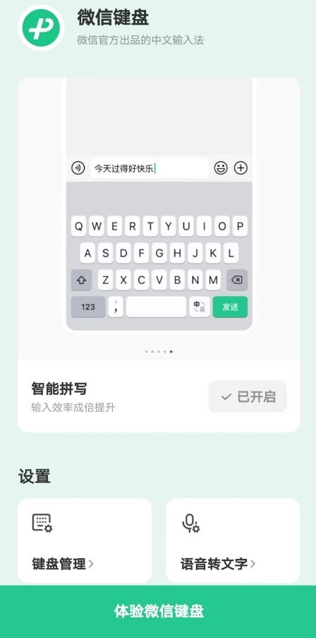 打开微信键盘App,映入眼帘的是清爽干净的绿白相间色调,其Logo以绿色圆底为背景,中间则是类似变形的白色字母“P”。