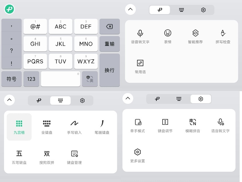 具体到输入法应用的键盘界面,依旧是以灰白绿色调为主,目前暂无个性化皮肤更换选项。整个输入法界面比较简单,点击左上角的“P”功能按键后分为三个部分,即拼写Plus功能区(包括语音转文字、表情、智能推荐等)、键盘选择区及设置区(包括单手模式、键盘调节等)。
