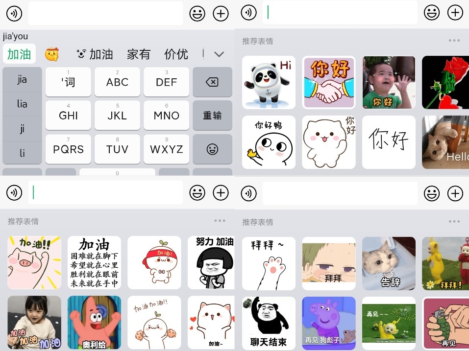 当记者输入“加油”、“再见”、“你好”等常用语关键词后,输入法会有动态表情推荐按钮,点击后会出现众多相关表情包,再次简化了在微信中搜索相关表情的步骤,体验感提升。
