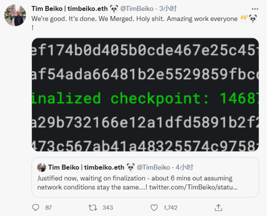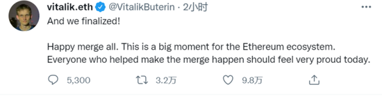在合并后的6分钟内,全世界与以太坊的核心开发人员一起焦急地观察,最终区块链网络通过股权证明成功地提出和批准新的交易区块,顺利完成了过渡,大家一起见证了加密货币行业这么多年来一直期待的历史性壮举。