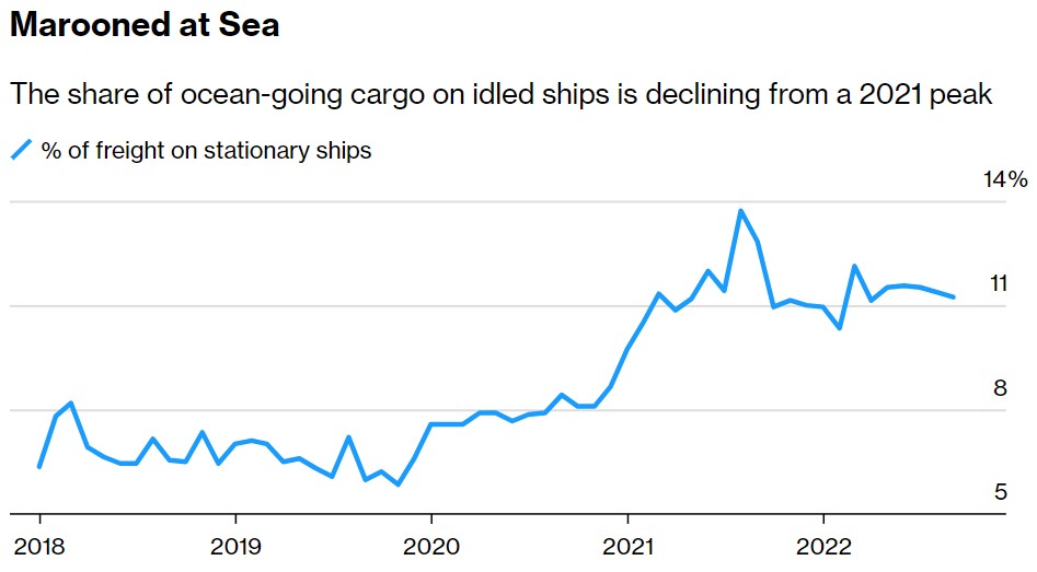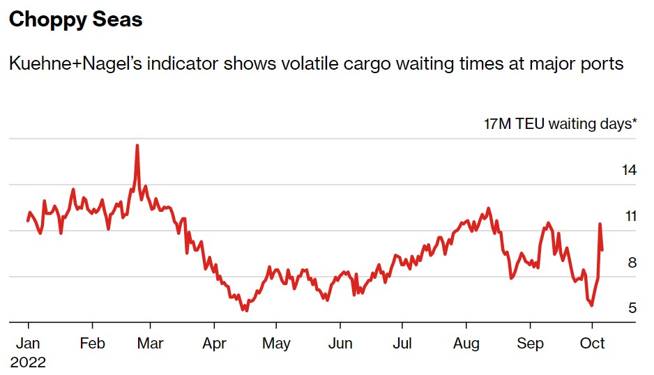 瑞士货运代理公司Kuehne+Nagel International AG的另一个航运中断指标显示了类似的情况——海运货物拥堵低于2022年初的峰值,但在经济动荡时期,延误仍在增加: