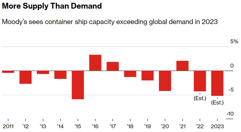 2023年和2024年下水的新船可能会加速该行业的颓势。根据穆迪的数据,订单与船队比率达28%,是自2010年以来的最高水平,而运力的增长将超过全球贸易量的预期。穆迪的报告称:“尽管随着运输生态系统继续自我调整,服务可靠性问题和运费上涨可能会持续到2023年,但我们认为,随着船舶供应的增加,以满足日益疲软的需求,承运人的收益现在已经见顶。”以下是今明两年这种不匹配的情况: