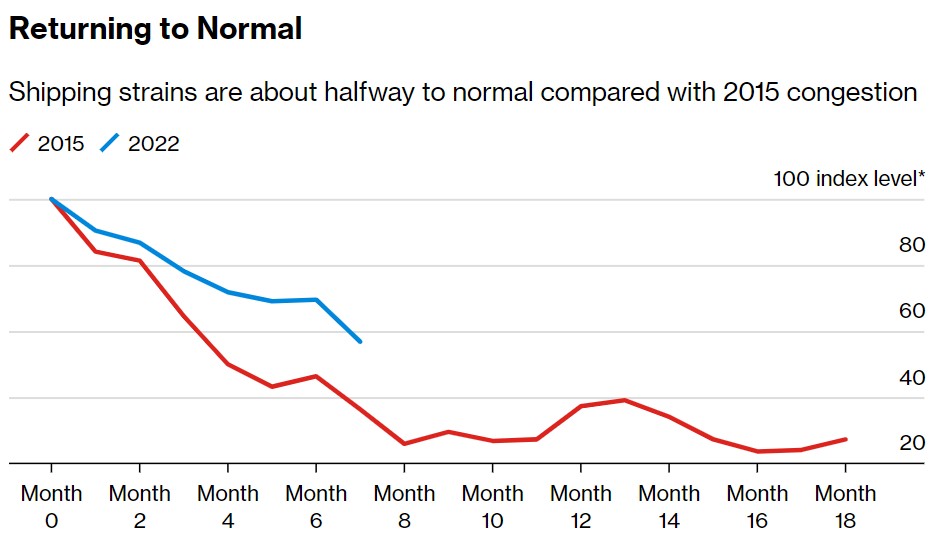 不过,供应链仍有望在明年年初恢复正常。Sea-Intelligence分析师在上周的一份报告中指出,大约一半的航运拥堵已经得到解决,根据一项指标,“完全恢复正常应该会在2023年3月到来”。另一个Sea-Intelligence模型将目前的情况与2015年经历的拥堵进行了比较,认为供应链在2023年初“正常”是可以实现的,除非出现更多意想不到的干扰: