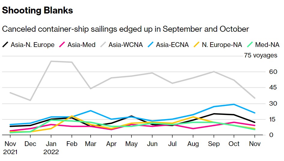 从某些方面来看,航运拥堵的解决速度与去年的货运系统崩溃速度一样快。这对那些在供应链混乱中发家致富的公司来说可不是好消息。今年以来,集装箱的即期运费下跌了约60%,因为航运公司正在努力应对与一年前面临的相反问题——运力过剩。英国德鲁里航运咨询公司(Drewry)的数据显示,就像航空公司取消一半预定的航班一样,航运公司正在通过一种被称为“空白航行(blank sailing)”的做法不再挂计划中的某一个港口——或整个航次取消——以使其可用空间与需求相匹配: