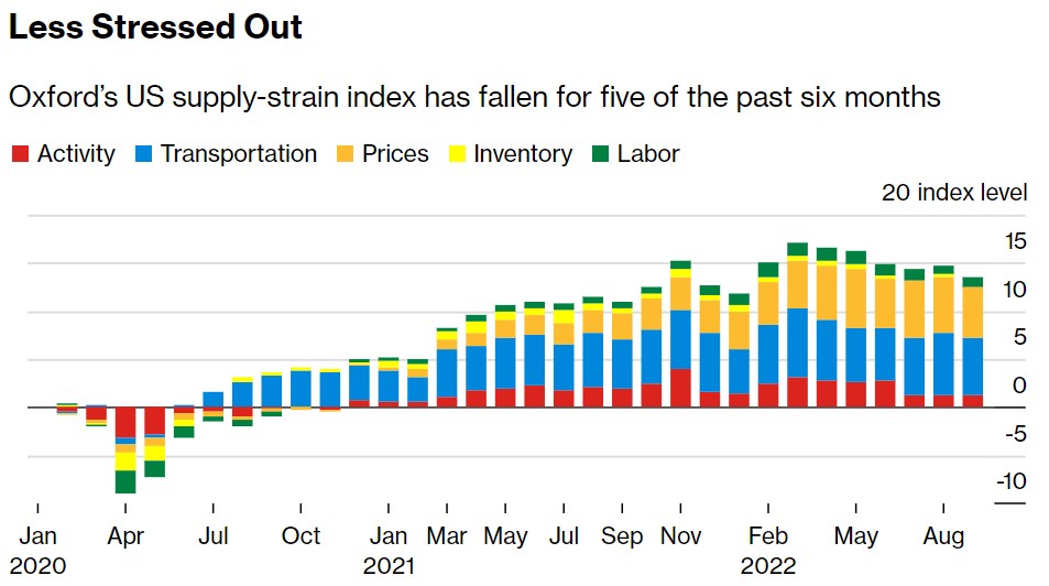 同样,牛津经济研究院一项反映美国供应紧张状况的指标在2月份见顶,并在9月份缓慢但稳步改善。这得益于发达经济体的消费者正在勒紧裤腰带。牛津大学首席美国经济学家Oren Klachkin表示:“在2022年的最后阶段和2023年,供应链状况应该会保持在一个更令人鼓舞的轨道上。需求疲软的好处之一是,它将缓解供应链的压力。”