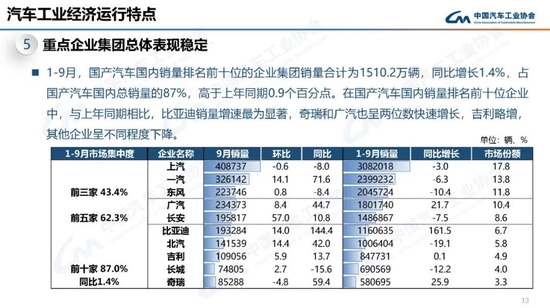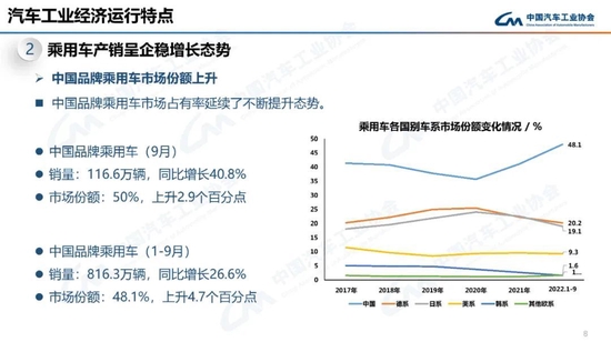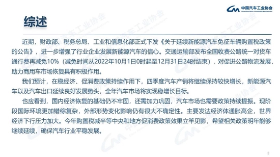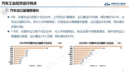 据中国汽车工业协会统计分析,2022年9月,汽车月产销快速增长,总体呈现“淡季不淡,旺季重现”的态势,带动行业企稳回升。当前我国经济总体延续恢复发展和向好发展态势,党中央、国务院推进稳经济一揽子政策发挥良好效能,接续政策细化实化、9月以来实施细则应出尽出,进一步扩大了有效需求,巩固了经济恢复基础。