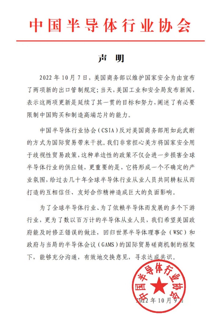 中国半导体行业协会发布声明称,2022年10月7日,美国商务部以维护国家安全为由宣布了两项新的出口管制规定。中国半导体行业协会(CSIA)反对美国商务部用如此武断的方式为国际贸易带来干扰。