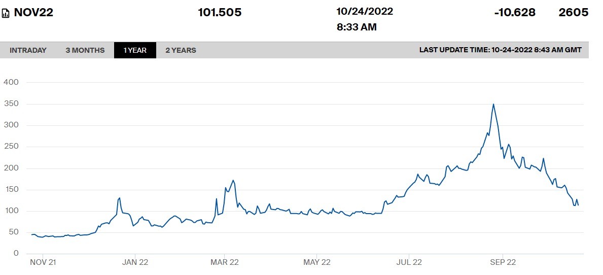 荷兰TTF近月天然气期货是欧洲天然气期货价格的基准,截至发稿,欧洲天然气价格下跌10.628%,至每兆瓦时101.505欧元,今日一度跌至100欧元水平。上周总计下跌约20%。