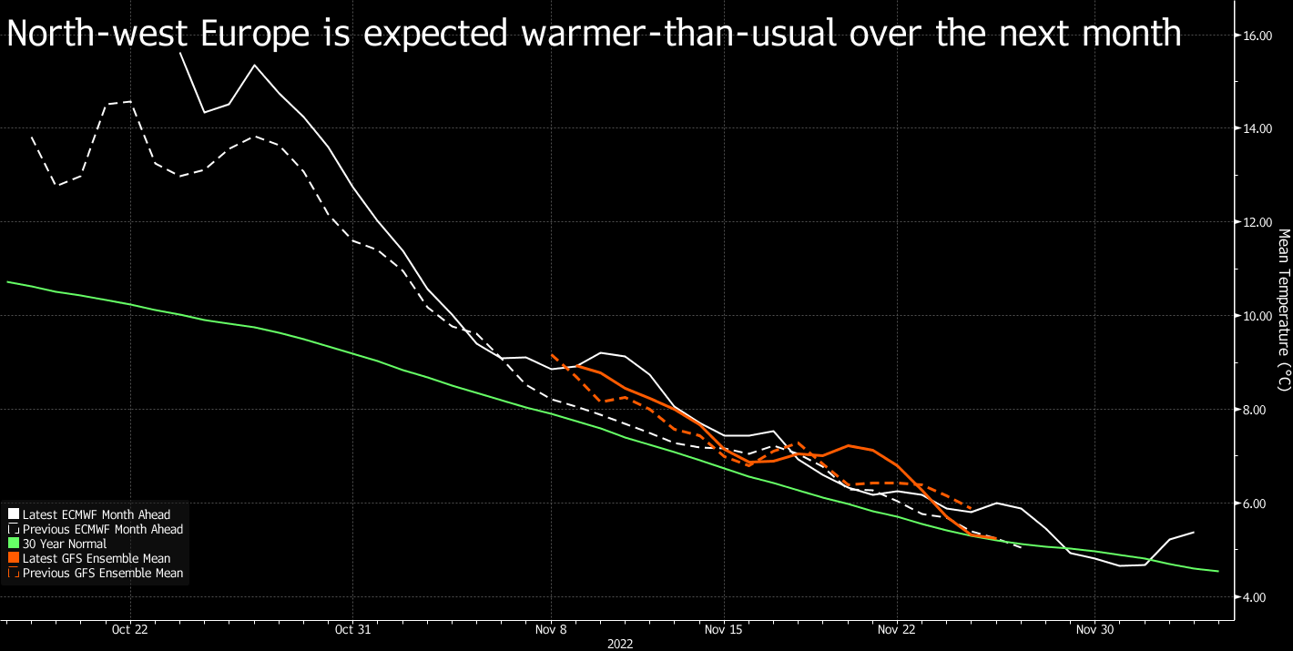TTF天然气价格今日一度下跌12%至100欧元/兆瓦时,较8月份的高点下跌约70%。并且天气预报显示整个欧洲大陆的气温可能将持续高于往年,直到本月底,这将推迟大规模供暖的时机,并使欧洲的天然气储存点继续被填满。同时,大量的液化天然气(LNG)进口量帮助将天然气储存量推高至高于通常水平。
