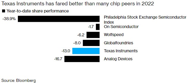 值得注意的是,除了德州仪器之外,包括三星电子、英特尔(INTC.US)和英伟达(NVDA.US)在内的许多半导体行业的大公司都警告称,需求正在急剧下降。2022年迄今为止,费城半导体指数累计下跌了约39%。不过,截至周二美股收盘,该指数已经连续七个交易日上涨,表明投资者认为该行业已经见底,这也是投资者一直希望看到的。德州仪器的股价在2022年为止累计下跌了约12%,但表现要好于多数同行。